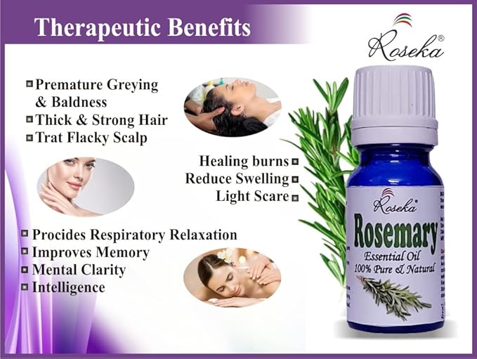 Roseka Rosemary Essential Oil (Rosmarinus officinalis) with internal Plastic Euro Dropper Natural Therapeutic Grade Steam Distilled | For Hair Growth Skin and Body Pure and Natural glowing Skin 10 ml